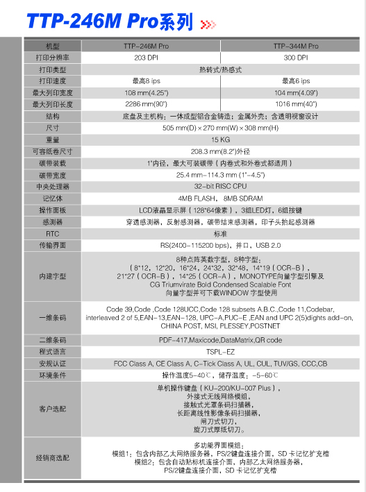 TTP-246M Pro經濟款系列是TSC針對高速、大量打印需求所*新開發的多功能工業等級條形碼打印機。機身結構系一體成型鋁合金鑄造而成,堅固、扎實、穩定性高。內建式以太網絡服務器、USB 2.0、串行接口與并行接口的標準通訊接口。好的選購配件包括USB host可搭配鍵盤或掃描儀、卷標剝離模塊、卷標回卷模塊、GPIO接口模塊、藍牙無線傳輸模塊、802.11b/g/n無線網絡模塊、多款切刀選擇。